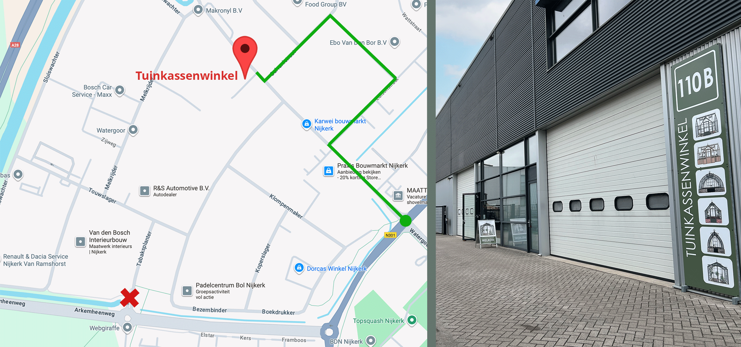 U kunt parkeren bij de bedrijven aan de rechterzijde van de straat. Onze showroom bevindt zich aan het pad aan de linkerzijde; de borden wijzen u naar de ingang.