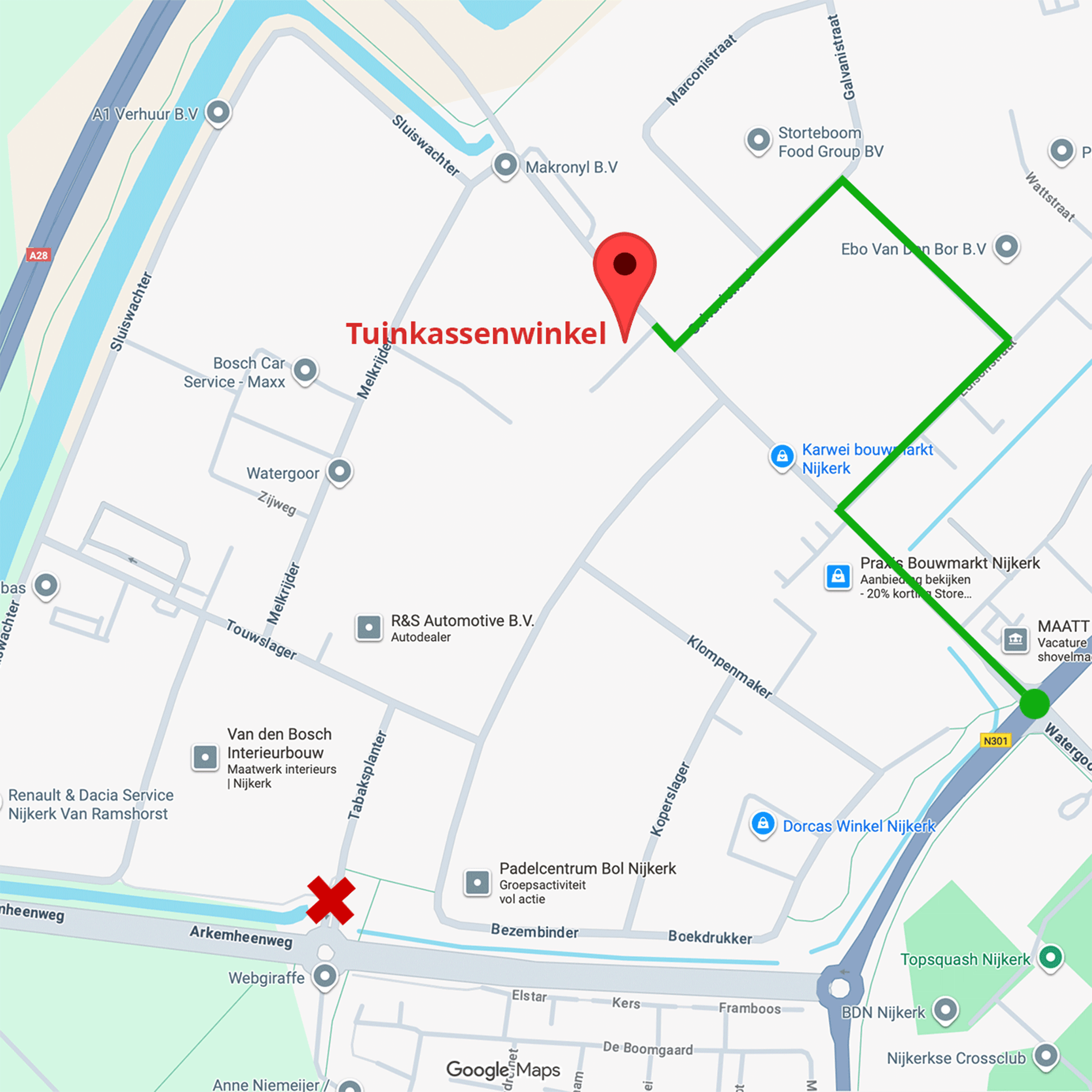Vanwege wegwerkzaamheden in Nijkerk zijn enkele wegen afgesloten. Hierdoor kan het zijn dat uw navigatiesysteem niet de juiste route aangeeft. Op het onderstaande kaartje ziet u de juiste omleidingsroute.
